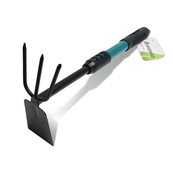 Комбинированный инструмент Greengo — настоящий помощник для истинных дачников. Вилка предназначена для аэрации почвы. Это процедура необходима для нормального развития и роста растений. Мотыжка отлично подойдёт для прополки. С данным приспособлением грядки и клумбы будут чистыми от сорняков.