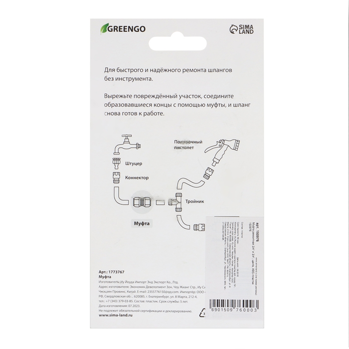 Муфта соединительная, для шлангов 3/4" (19 мм), цанговое соединение, рр-пластик, Greengo