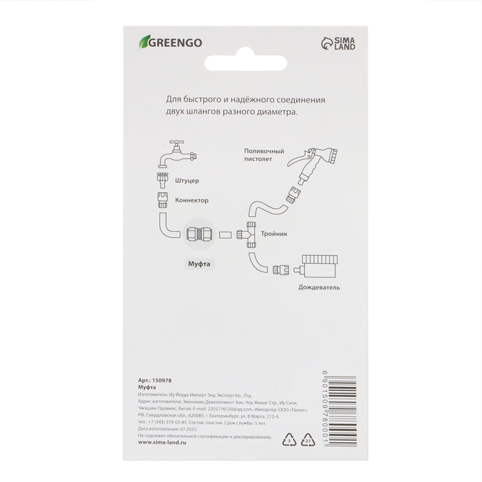 Муфта соединительная, для шлангов 3/4" (19 мм), цанговое соединение, рр-пластик, цвет МИКС, Greengo