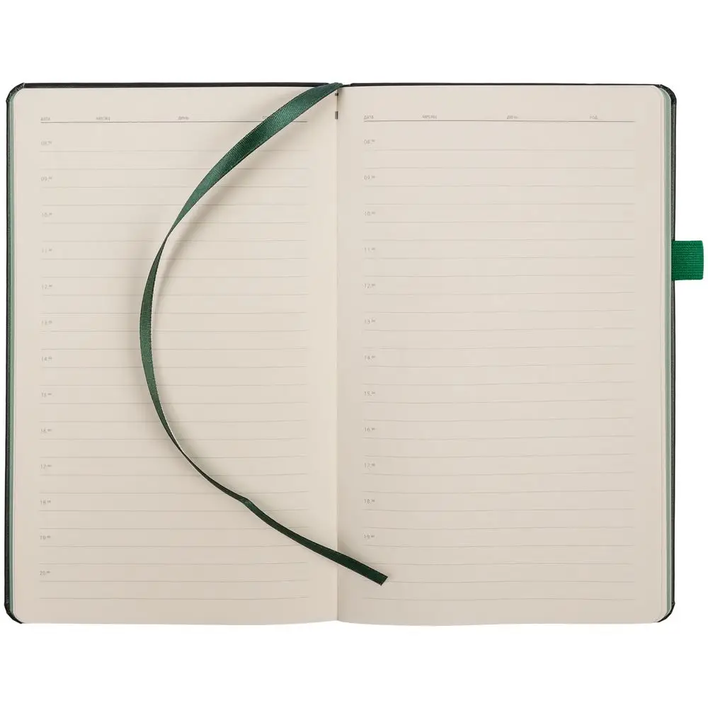 Ежедневник с полутвердой обложкой, выполнен из материала Waltz, черный АА, дополнен зеленой резинкой с металлическим шильдом и ляссе.