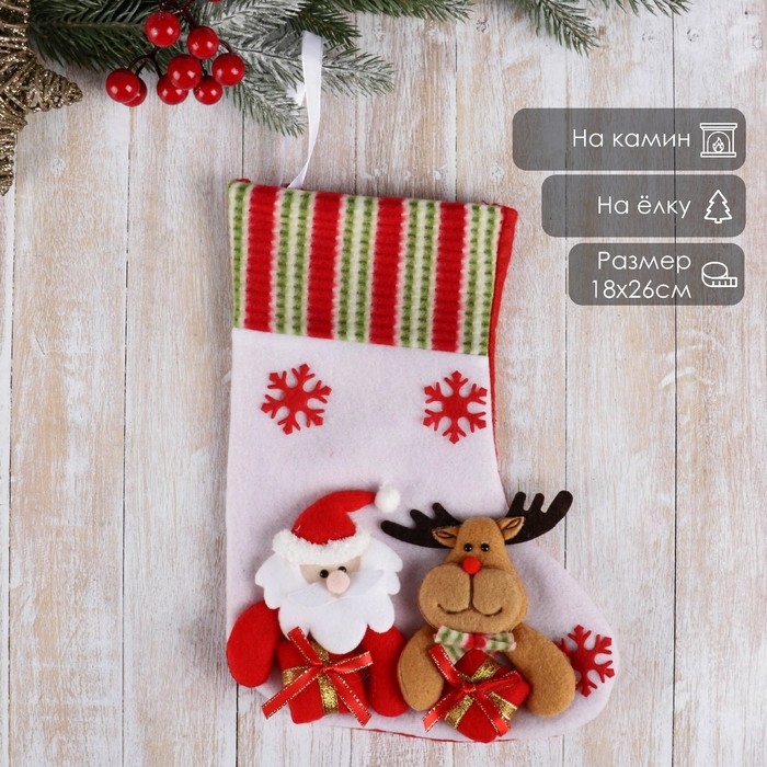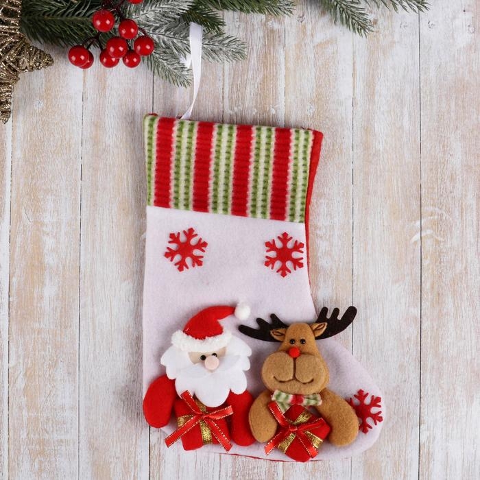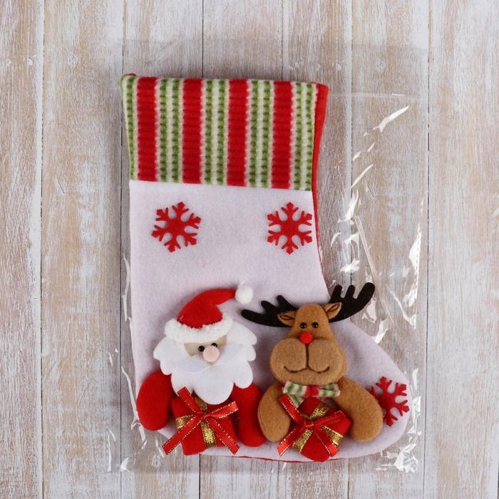 Носок для подарков "Дед Мороз с оленем" 26х18 см. бело-красный