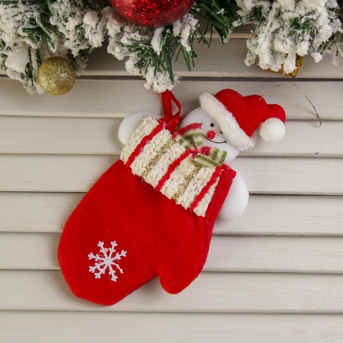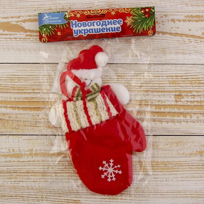 Мягкая подвеска "Варежка - Снеговик, блестящие полосочки" 20х10 см, красный