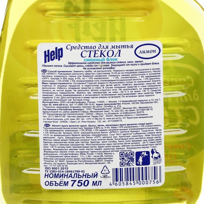 Средство для мытья стёкол и зеркал Help "Лимон" без распылителя, 750 мл