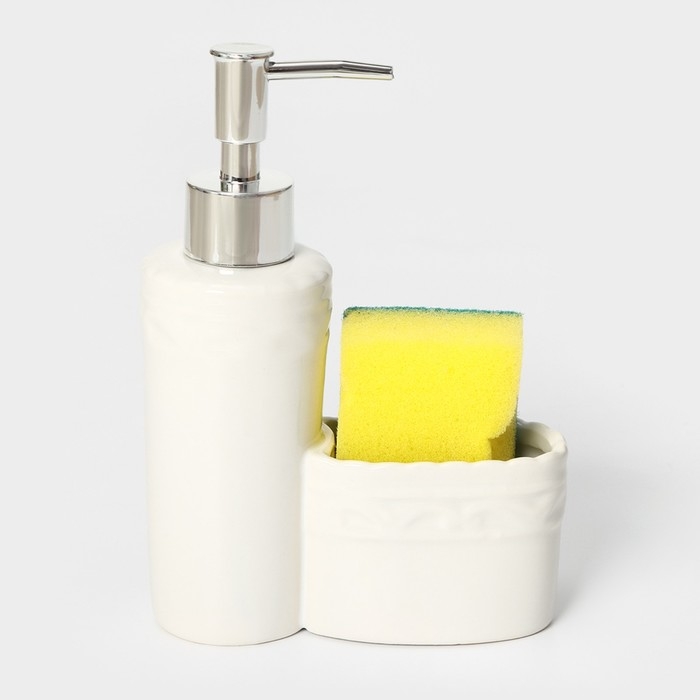 Декорированные прелестным орнаментом, изделия украсят знакомую обстановку и создадут позитивное настроение. Хозяйкам непременно понравится специальное отделение для комфортного хранения губки непосредственно в дозаторе.