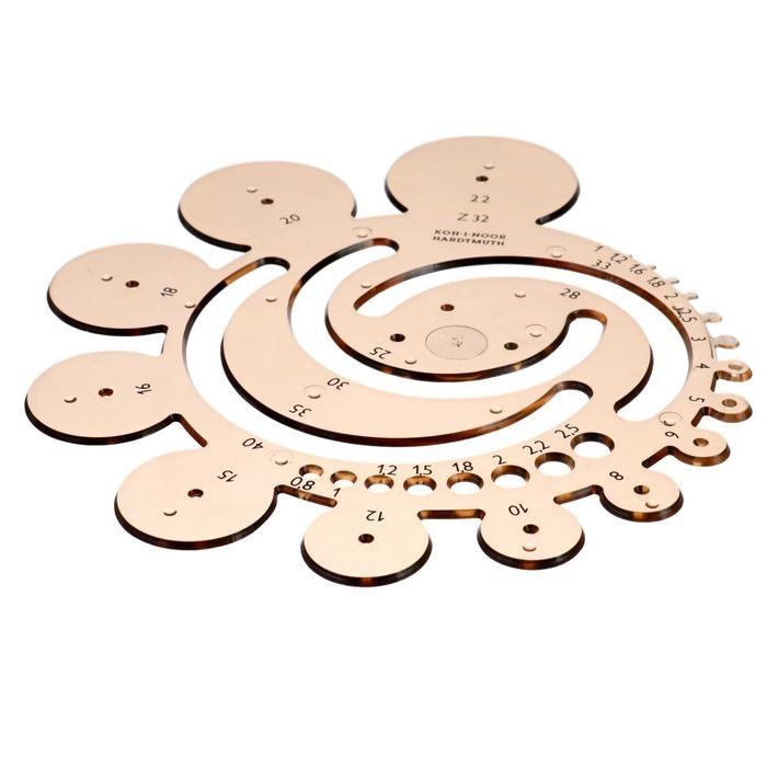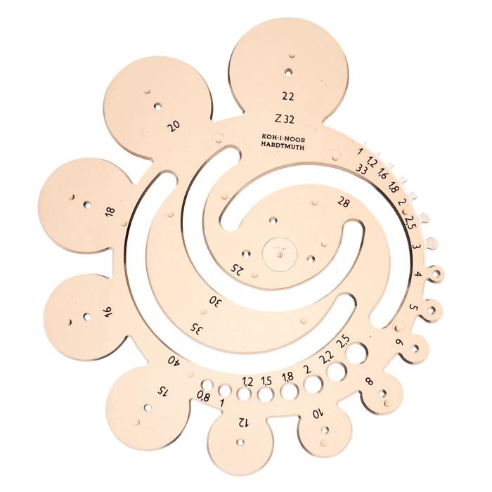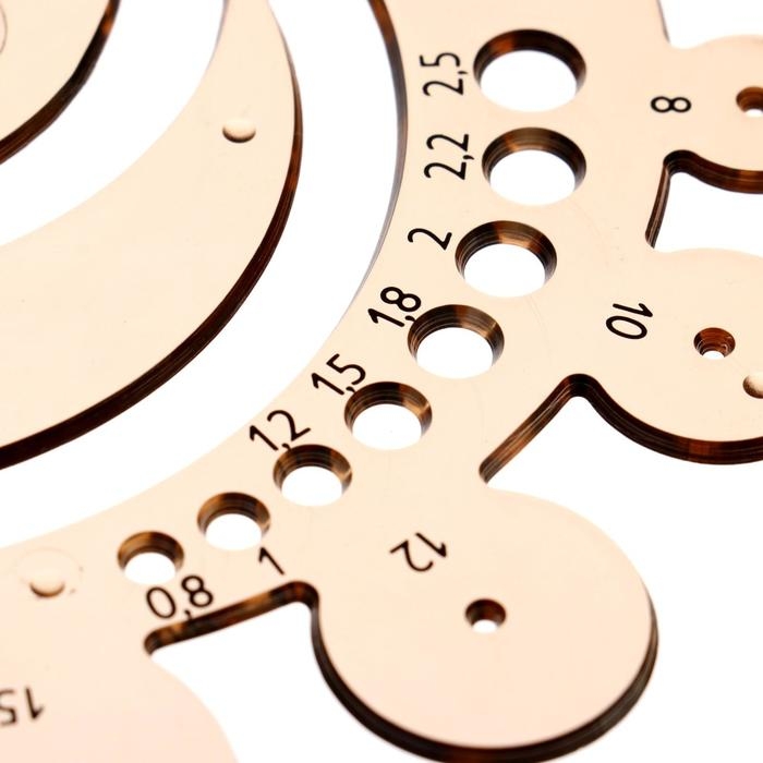 Шаблон изготовлен из дымчатого прозрачного полистирола. Предназначен для использования с заточенным карандашом, механическим карандашом, метательным карандашом или техническими ручками. Используется для рисования и черчения радиусов различных размеров и небольших окружностей. Он содержит круги диаметром 0,8-2,5 мм и радиусами 1-40 мм. Размер кругов и радиусов определяется с помощью черной трафаретной печати, которая устойчива к износу и разрыву при обычном использовании. Шаблон предназначен для рисования и технического черчения в школах и офисах.