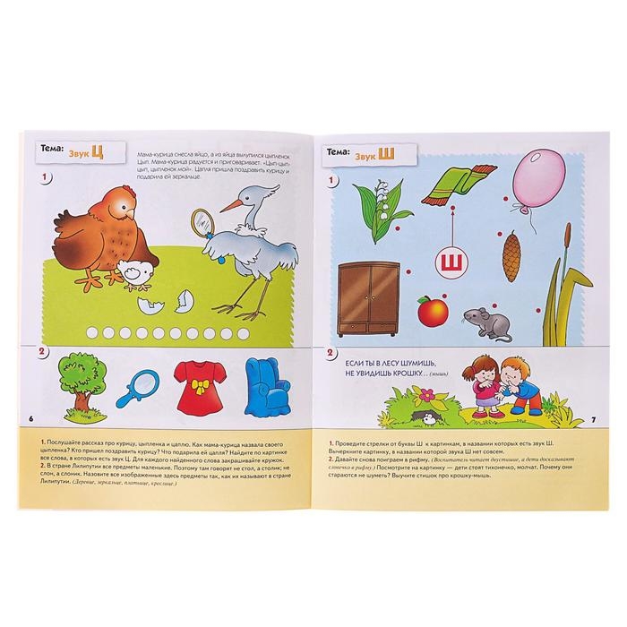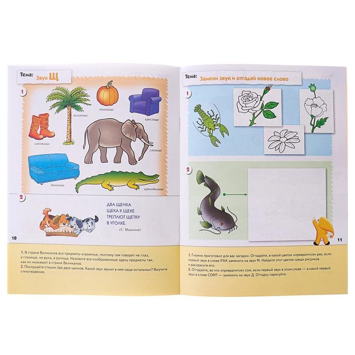 Рабочая тетрадь «Уроки грамоты для малышей. Средняя группа» содержит упражнения, благодаря которым ребёнок знакомится со звуками, узнаёт, что они могут рычать, жужжать и шипеть.