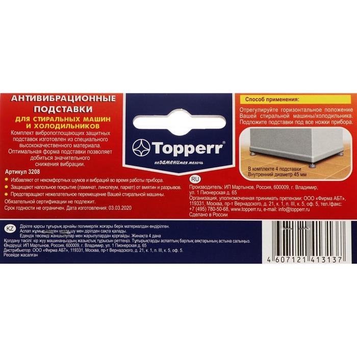 Способ применения: отрегулируйте горизонтальное положение Вашей стиральной машины. Подложите подставки под все ножки прибора.