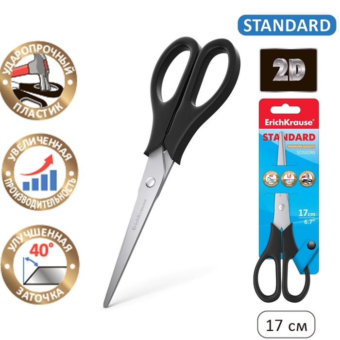 Ножницы ErichKrause Standard, 17 см, с улучшенной двойной заточкой, лезвия из нержавеющей стали, чёрные