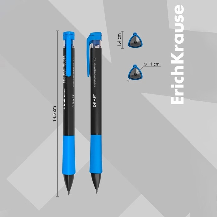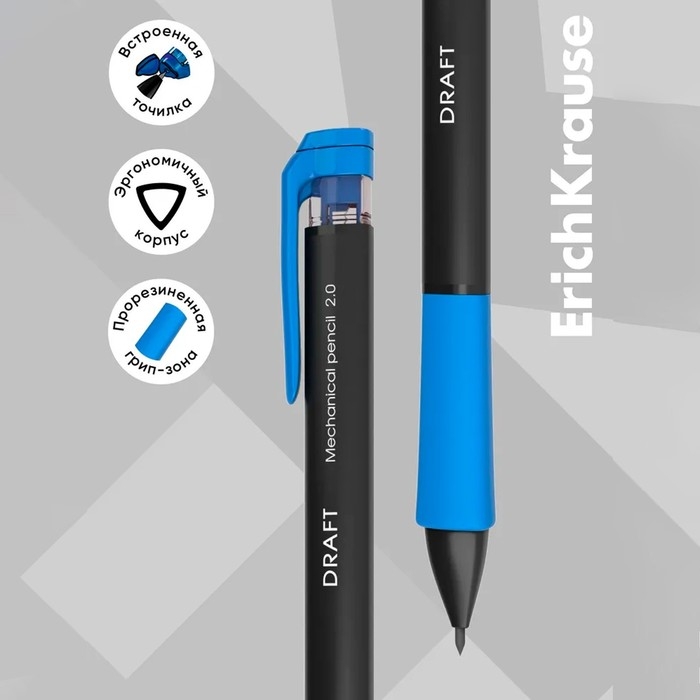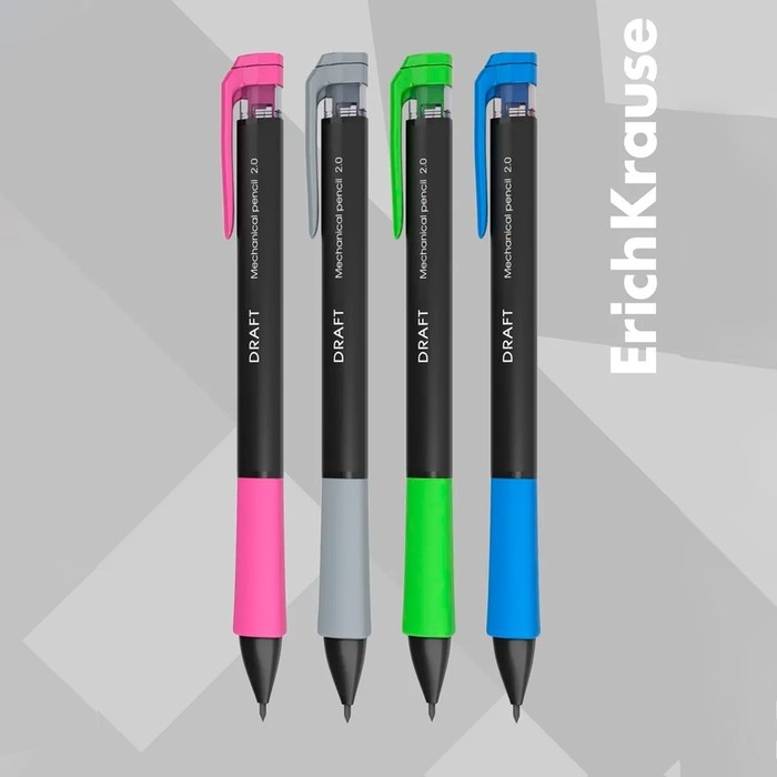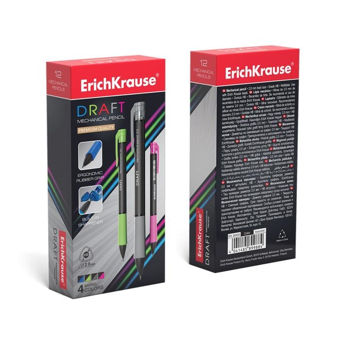 Карандаш механический Erich Krause "DRAFT", НВ, грифель d=2,0 мм, трёхгранный, резиновый упор, точилка, в коробке, микс