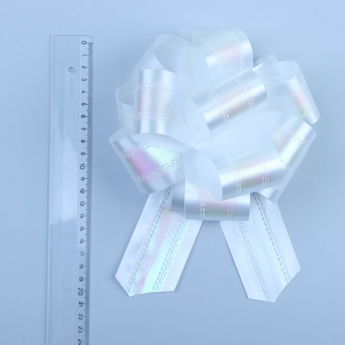 Для того чтобы собрать бант, надо потянуть за две ленточки, находящиеся между широкими лентами, удерживая широкие ленты в месте спайки. Бант собирается за несколько секунд.