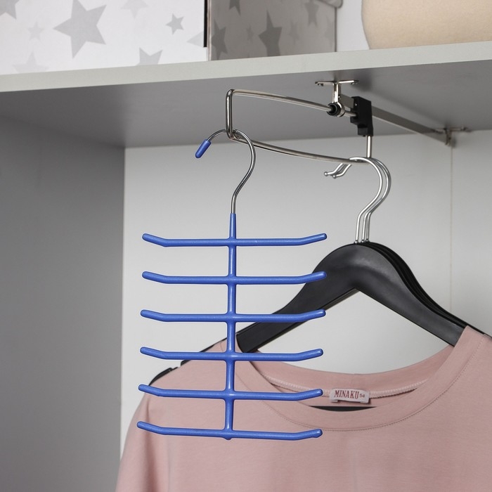 Благодаря компактной и функциональной конструкции не составит труда разместить вешалку на перекладину в шкафу. Антискользящая поверхность с ПВХ покрытием обеспечит надежную фиксацию вещей, а множество перекладин позволят хранить на ней не только галстуки, но и другие специфические для хранения вещи – шарфы и ремни.