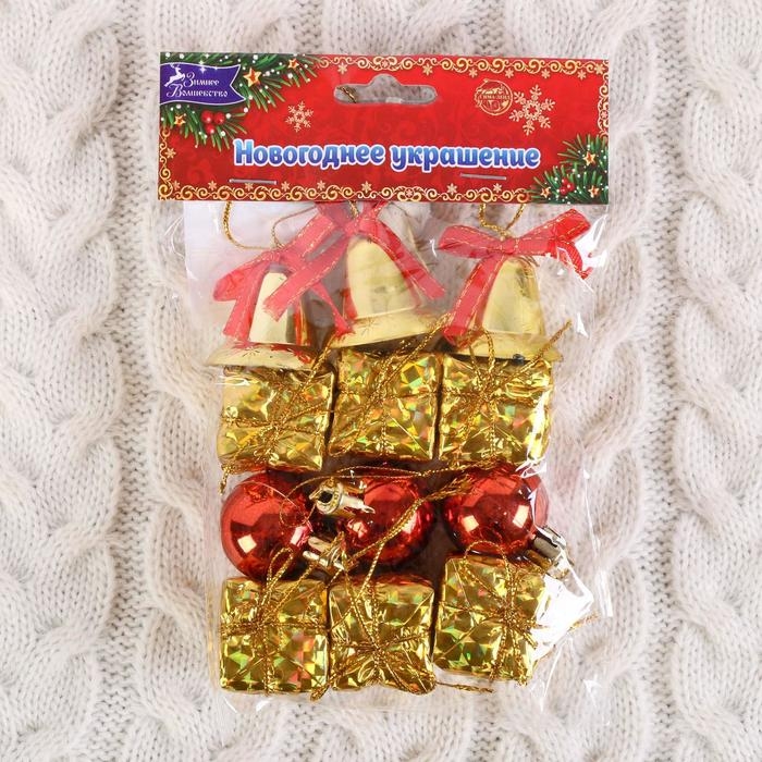 Набор украшений пластик 12 шт "Лючия" (6 подарков,3 шарика,3 колокольчика) золотисто-красный