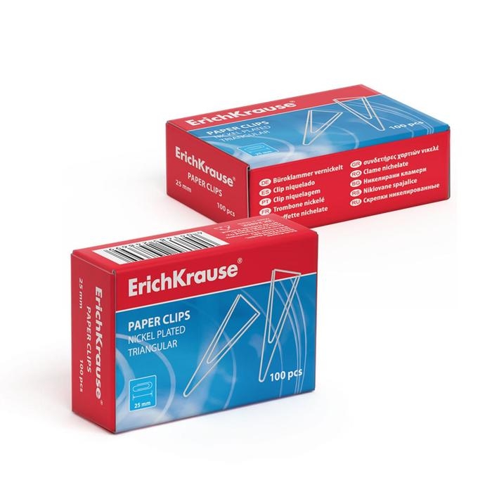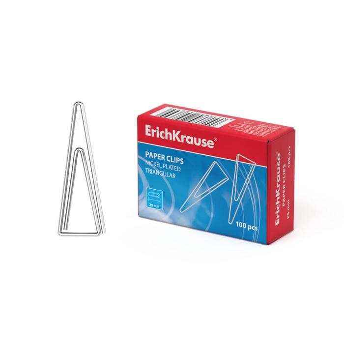Скрепки канцелярские 25 мм, 100 штук, ErichKrause, никелированные, треугольные, картонная упаковка