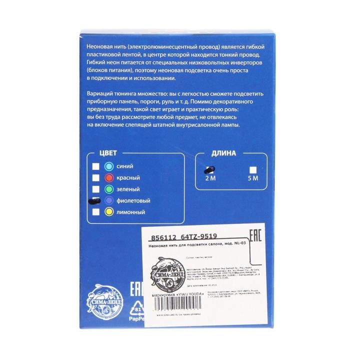 Неоновая нить Cartage для подсветки салона, адаптер питания 12 В, 2 м, фиолетовый