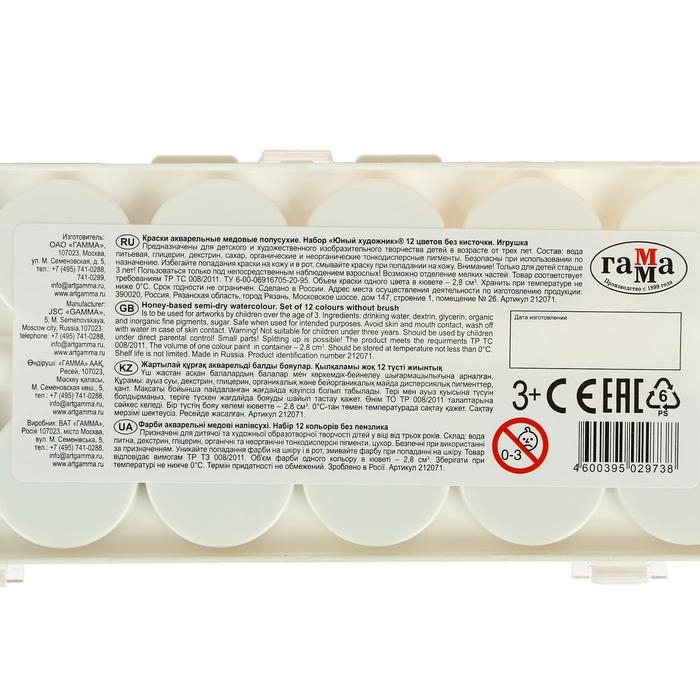Акварель 12 цветов "Гамма" "Юный художник", медовая, без кисти, пластик