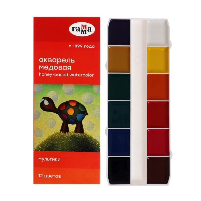 Акварель 12 цветов "Гамма" "Мультики", медовая, без кисти, картон