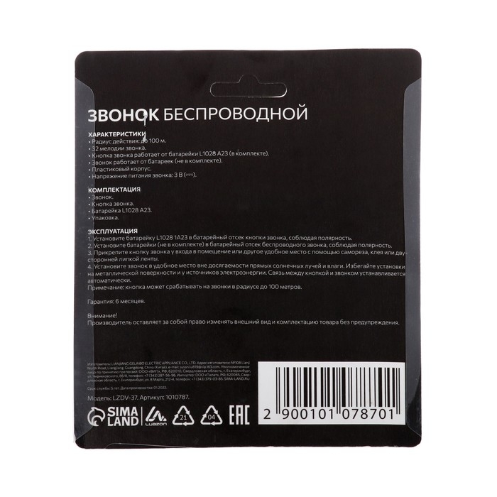 Звонок LuazON LZDV-37 предназначен для установки в закрытых помещениях – в квартирах, домах, производственных цехах и административных зданиях. После установки батареек связь между звонком и приёмником настраивается автоматически посредством радиоволн.