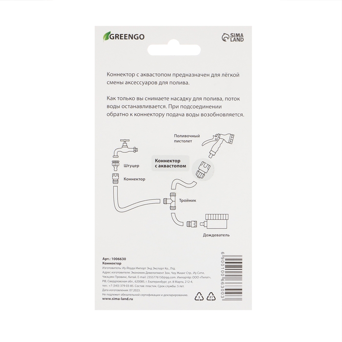 Коннектор с аквастопом, 5/8" (16 мм), быстросъёмное соединение, рр-пластик, Greengo