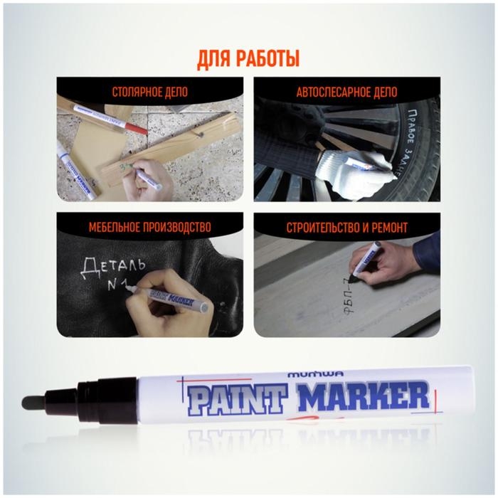 Маркер-краска (лаковый маркер) MunHwa - профессиональный лаковый маркер на нитрооснове. Маркер-краска MunHwa пишет на всех типах поверхностей: металл, дерево, резина, бетон, стекло, кожа. Цвет чернил - черный, диаметр пишущего узла - 4 мм.