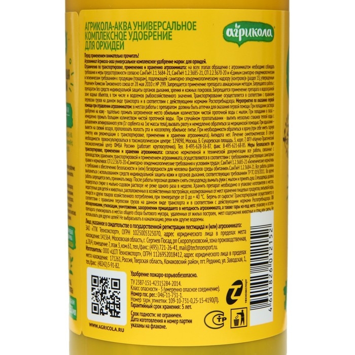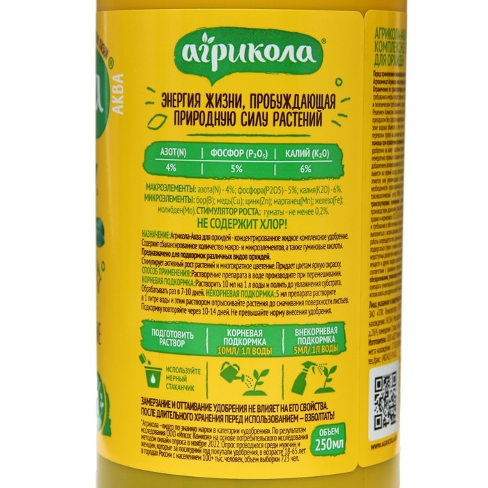 Агрикола Аква – концентрированное жидкое комплексное удобрение. Содержит сбалансированное количество макро – и микроэлементов, а также гуминовые кислоты. Предназначено специально для подкормок различных видов орхидей. Стимулирует активный рост растений, цветение, придает растениям яркую окраску.