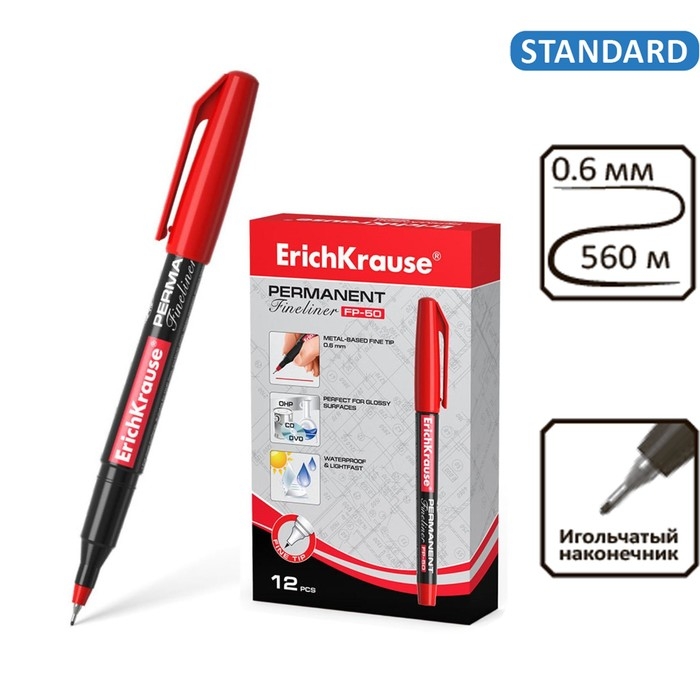 Маркер - лайнер перманентный ErichKrause FP-50, 0.6 мм, чернила на спиртовой основе светостойкие, водостойкие. Для письма на любой поверхности, красный
