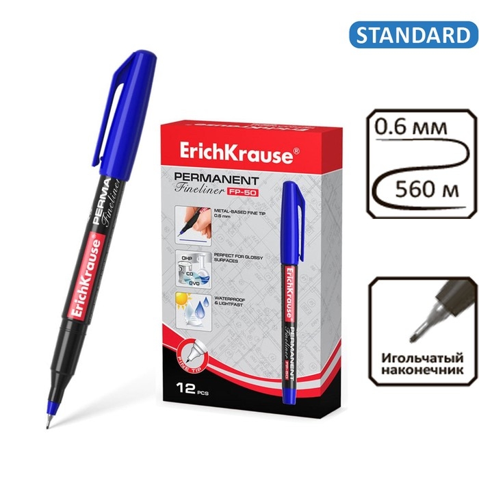 Маркер - лайнер перманентный ErichKrause FP-50, 0.6 мм, чернила на спиртовой основе, светостойкие и водостойкие, для любых поверхностей, синий
