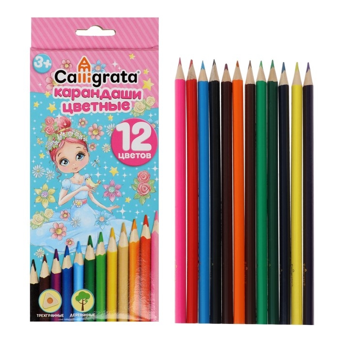 Карандаши цветные 12 цветов "Принцесса", корпус деревянный, треугольный