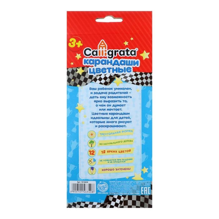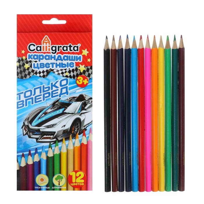 Карандаши цветные 12 цветов "Машинка", корпус деревянный, трёхгранный