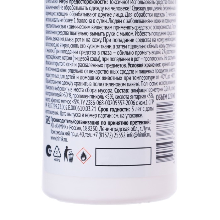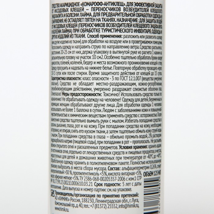 На природе многие люди сталкиваются с клопами, москитами и другими опасными насекомыми, которые способны причинить массу вреда. Они переносят инфекцию, пьют вашу кровь и просто раздражают своим внешним видом. Вы устали бороться с ними? Спрей «Комарофф» обязательно защитит вас от вредных насекомых! Спрей эффективно защитит вас от лесных и таёжных клещей. Средство предназначено для предварительной обработки одежды и снаряжения. Не оставляет пятен на тканях. Меры предосторожности: не допускайте попадания препарата на кожу, в глаза или рот. В противном случае обильно промойте это место водой. Людям с заболеваниями кожи и повышенной чувствительностью к химическим веществам следует применять средство с осторожностью. После работы с препаратом тщательно вымойте руки с мылом. Способ применения Разложите или развесьте одежду для обработки на воздухе или в проветриваемом помещении. Распыляйте препарат на ткань с расстояния 20‒25 см, держа упаковку на вытянутой руке. Наносите средство из расчёта 1 нажим на клапан на 1 дм². Особенно тщательно распыляйте средство на область вокруг щиколоток, коленей, бёдер, плечевого пояса и других мест возможного проникновения клещей на тело. Под обработанную одежду обязательно надевайте нижнее бельё. Повторно использовать средство следует по мере необходимости, но не чаще, чем через 10 суток или после стирки. Храните средство в местах, недоступных для детей, при температуре от 0 °C до + 30 °C, вдали от источников огня и отдельно от пищи. Состав: альфа-циперметрин, изопропиловый спирт, отдушка.