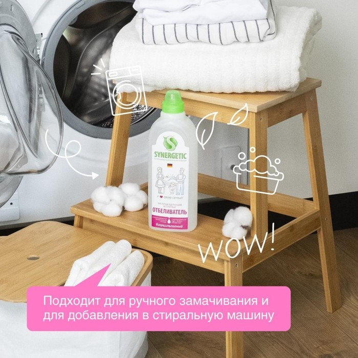 Универсальный биоразлагаемый отбеливатель для белья SYNERGETIC – бесхлорное средство с активным кислородом для отбеливания и сохранения белизны всех видов тканей. Эффективен даже в холодной воде. Отбеливатель подходит для использования в качестве добавки к моющему средству для ручной или машинной стирки или для предварительного замачивания вещей со сложными загрязнениями и въевшимися пятнами. Не повреждает волокна тканей и сохраняет яркость белья. Экологичный и безопасный отбеливатель полностью выполаскивается из волокон ткани и не остается на одежде. Средство безопасно на природы и человека, подходит для стирки детского белья 0+ и одежды людей с чувствительной кожей. Концентрат создан из растительных компонентов: уникального комплекса растительных Н-тензидов и активного кислорода. Он не содержит хлора, ароматизаторов, красителей, фосфатов, агрессивных ПАВ. Биоразлагаемый отбеливатель безопасен для септических установок: попадая в среду септика, средство «понятно» для микроорганизмов и без труда распадается на простые соединения. Для замачивания добавьте в воду 4 колпачка (120 мл) отбеливателя на 2 л воды температурой 40 °C, затем положите белье на 30 - 60 минут и постирайте. Для увеличения эффективности моющего средства добавьте 2 колпачка (60 мл) отбеливателя на 5 кг белья в отсек стиральной машины, предназначенный для моющего средства (если иное не прописано в инструкции для стиральной машины). Закройте отсек и включите стиральную машину в соответствии с инструкцией. Соблюдайте режим стирки, указанный на ярлыке изделия. Не наносите отбеливатель непосредственно на ткань во избежание изменения ее цвета. Новые, а также светлые и цветные вещи стирайте отдельно, если степень устойчивости окраски ткани не известна. Рекомендуемая температура стирки 30 - 40 °C. Хранить при температуре от +5 до +25 °С вдали от нагревательных приборов и огня. Не допускается хранение под непосредственным воздействием солнечного света.Только для наружного применения. Беречь от детей. При попадании средства в глаза промыть водой. Использовать строго по назначению. Гель :Aqua; Lauryl Glucoside; Cocamidopropyl Betaine; Sodium Lauroyl Methyl Isethionate; Candida Bombicola/Glucose/Methyl Rapeseedate Ferment; Lauroyl/Myristoyl Methyl Glucamide; Coco-Glucoside; Glyceryl Oleate; Pentylene Glycol; Glycerin; Fructose; Urea; Citric Acid; Sodium Hydroxide; Maltose; Sodium PCA; Sodium Chloride; Sodium Lactate; Trehalose; Allantoin; Sodium Hyaluronate; Glucose; Aloe Barbadensis Leaf Juice; Parfum; Babassu Oil Polyglyceryl-4 Esters; Sweet Almond Oil Polyglyceryl-4 Esters; Hydroxypropyl Guar Hydroxypropyltrimonium Chloride; Saccharide Isomerate; Tetrasodium Glutamate Diacetate; Verbena Officinalis Leaf Extract; Citrus Aurantium Bergamia Fruit Extract; Sodium Citrate; Sodium Benzoate; Potassium Sorbate.Мыло : Aqua; Biobased Sodium Laureth Sulfate; Sodium Lauroamphoacetate; Lauryl Lactate; Candida Bombicola/Glucose/Methyl Rapeseedate Ferment; Coco Glucoside; Glyceryl Oleate; Parfum; Macadamia Seed Oil Polyglyceryl-4 Esters; Punica Granatum Seed Oil Polyglyceryl-4 Esters; Hydroxypropyl Guar Hydroxypropyltrimonium Chloride; Saccharide Isomerate; Tetrasodium Glutamate Diacetate; Glycerin; Verbena Officinalis Leaf Extract; Citrus Aurantium Bergamia Fruit Extract; Sodium Citrate; Sodium Chloride; Sodium Benzoate; Potassium Sorbate.