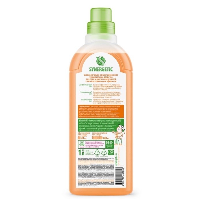 Биоразлагаемое концентрированное средство с антибактериальным эффектом SYNERGETIC - универсальное средство для ежедневной и генеральной уборки пола и других поверхностей: столов, стен, потолка.