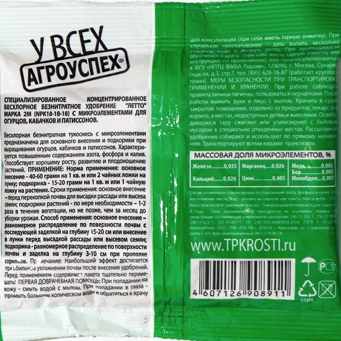 Примечание: Наибольший эффект достигается при обильном увлажнении почвы после внесения удобрений. Перед применением содержимое пакета тщательно перемешать!