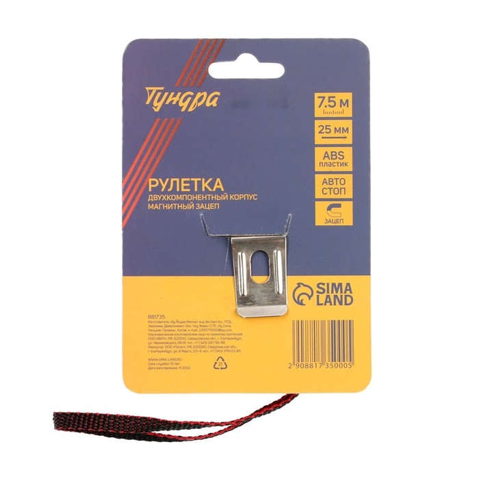 Рулетка ТУНДРА, двухкомпонентный корпус, автостоп, магнитный зацеп, 7.5 м х 25 мм