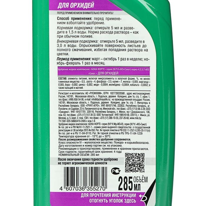 Предназначено для сбалансированного питания, пышного и продолжительного цветения, способствует образованию сильных цветков, а также повышает иммунитет орхидей.
