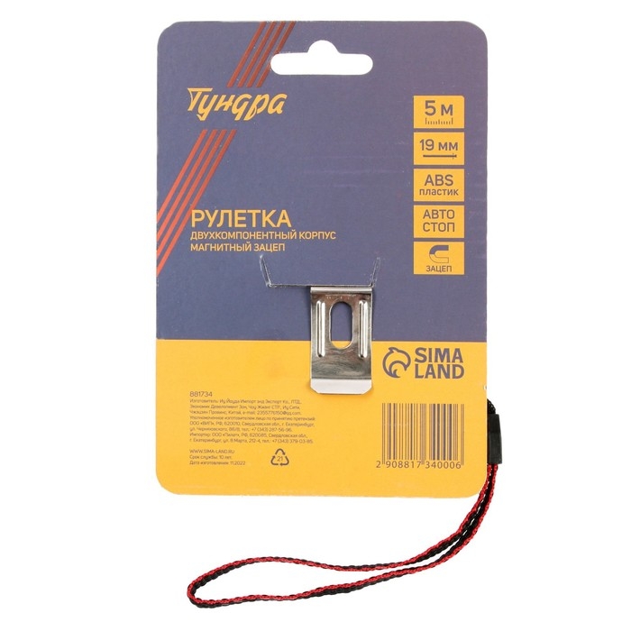 Рулетка ТУНДРА, двухкомпонентный корпус, автостоп, магнитный зацеп, 5 м х 19 мм