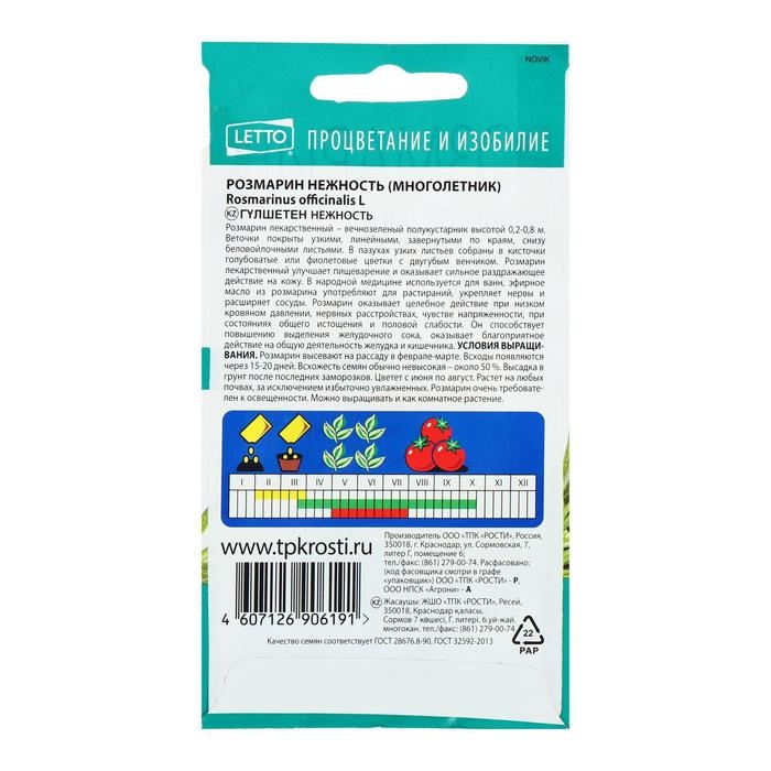 Розмарин высевают на рассаду в феврале-марте. Всходы появляются через 15-20 дней. Всхожесть семян обычно невысокая — около 50%. Высадка в грунт после последних заморозков. Цветёт с июня по август. Растет на любых почвах, за исключением избыточно увлажненных. Розмарин очень требователен к освещенности. Можно выращивать и как комнатное растение.