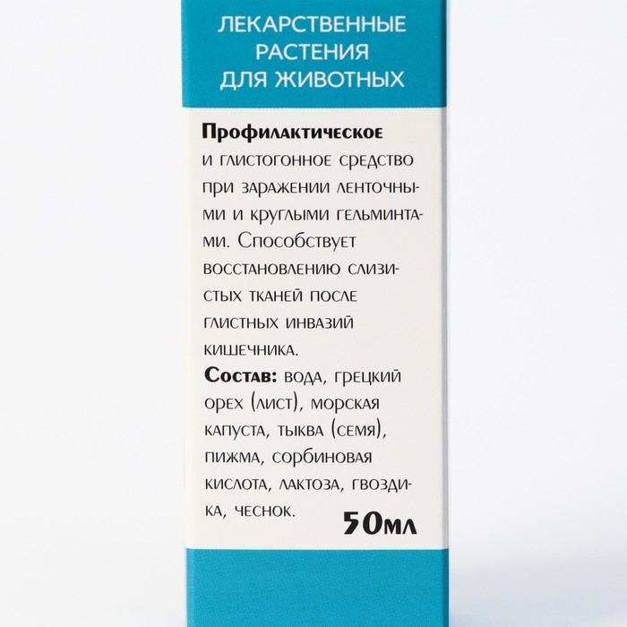 Состав: экстракты грецкого ореха молочно-восковой спелости, семян тыквы, полыни, гвоздики, чеснока, пижмы. Глистогонный препарат для собак «Глистогон» производства УнИК «Литораль» — это композиция из 6-ти лекарственных трав, каждая из которых традиционно считается сильнейшим природным средством от глистов. Важно помнить, что паразиты от любимого питомца могут перейти и к человеку, поэтому крайне важно заниматься не только лечением, но и профилактикой появления глистов. Если у вас дома несколько животных, глистогонный препарат для собак следует давать всем им одновременно. Благодаря входящим в состав травам «Глистогон» не только изгоняет паразитов и исключает интоксикацию организма, но и способствует регенерации поврежденных тканей. В глистогонный препарат для собак «Глистогон» производства УнИК «Литораль» входят следующие компоненты: Грецкий орех молочно-восковой спелости — обладает противоглистными, бактерицидными и слабительными свойствами. Одним из активных компонентов, содержащимся в грецком орехе, является юглон. Юглон подавляет активность ферментов отвечающих за активацию клеток, тем самым не давая проникнуть в клетку токсинам. Поэтому при повреждении паразита, отсутствует токсический эффект. Пижма — присутствие в пижме туйона, оказывает расслабляющее действие на мускулатуру аскарид и остриц, способствуя их откреплению и выведению из организма. Входящие в состав пижмы флавоноиды способствуют регенерации слизистых оболочек и тканей. Полынь — улучшает пищеварение, оказывает антигельминтное, желчегонное и мягкое слабительное действие. Используют в качестве противоглистного средства при кишечных паразитах. Гвоздика — противоглистное, противомикробное действие. Чеснок — является эффективным средством от кишечных паразитов (глистов) и инфекционных болезней. Тыква, семя — антигельминтное средство. Наиболее эффективного в отношении различных ленточных глистов, солитера. Кроме того, они оказывают желчегонное и слабительное действие, что также способствует выведению паразитов из кишечника. Показания к применению: Профилактическое и глистогонное средство при заражении ленточными и круглыми гельминтами. Способствует восстановлению слизистых тканей после глистных инвазий. Способ применения и дозы: принимать 2 раза в день с кормом в течение месяца: 1 колпачок при весе до 5 кг. 2 колпачка при весе более 5 кг. 1 колпачок — 5 мл. Курс профилактики 4 раза в год.
