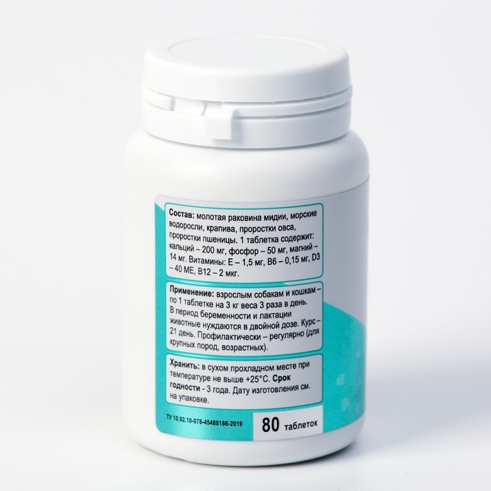 «Кальцемид» — источник кальция, йода, витаминов группы В и D, предупреждает истончение костной ткани, снижает риск травм и переломов, трещин и вывихов, улучшает работу мышц и суставов, способствует правильному росту и гармоничному развитию организма. Состав: молотая раковина мидии, морские водоросли, проростки овса, пшеница, крапива. В 1 таблетке содержится: D3 — 700 МЕ; Е — 1,5 мг; В6 — 0,15 мг; В12 — 2 мкг; кальций — 0,2 г; фосфор — 50 мг; калий — 110 мг; магний — 14 мг. Молотая раковина мидии — источник органического кальция. Кальций обеспечивает полноценное формирование костей, смену и рост зубов, участвует в нервно-мышечной проводимости, предупреждает аллергические реакции и регулирует свертываемость крови. Морские водоросли — содержат практически полный набор макро- и микроэлементов, широчайший спектр витаминов, аминокислоты, а также уникальные питательные вещества, не встречающиеся в наземных растениях (альгинаты, фукоидан, манит и др.). Проростки овса — обладают тонизирующим, общеукрепляющим и противовоспалительным действием. Способствуют эффективному пищеварению и прекрасно помогают при общих нарушениях работы желудочно-кишечного тракта. Крапива — обладает общеукрепляющими свойствами. Повышает сопротивляемость организма ко многим бактериям, токсинам, укрепляет иммунитет, а также обеспечивает высокую степень защиты организма от кислородной недостаточности. Пшеница — повышает иммунитет, улучшает состояние шерсти, кожи и когтей. Рекомендовано для гармоничного развития скелета, зубов, а так же при травмах, переломах костей, кормлении. Повышает сопротивляемость организма к инфекциям и кожным заболеваниям. Особенно необходим в период вынашивания плода и кормления. Применение: крупные собаки — по 2 таблетки 3 раза в день, средние собаки — по 1 таблетке 3 раза в день, щенки, мелкие собаки, кошки — по 0,5 таблетки 3 раза в день.