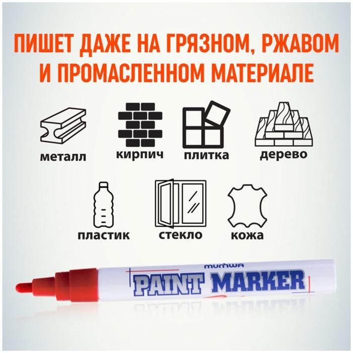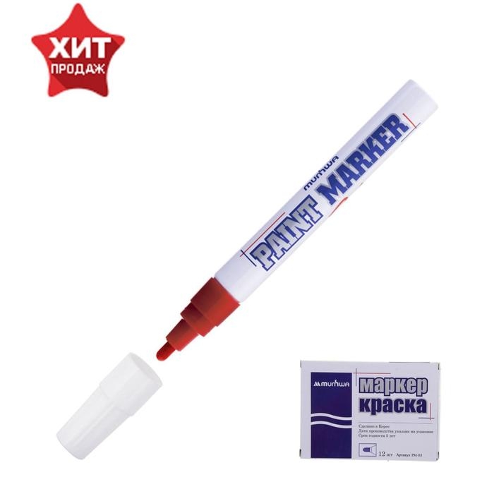 Маркер-краска (лаковый маркер) MunHwa - профессиональный лаковый маркер на нитрооснове. Маркер-краска MunHwa пишет на всех типах поверхностей: металл, дерево, резина, бетон, стекло, кожа. Цвет чернил - красный, диаметр пишущего узла - 4 мм.