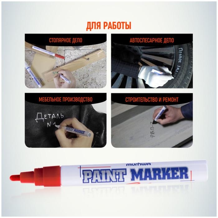 Paint Marker подходит для реставрации дефектов на бытовой технике, обуви, кузове автомобиля, а также надписей на каменных плитах. Маркер-краска MunHwa имеет широкое применения в дизайне, декорировании и оформлении. Корпус маркера изготовлен из прочного алюминия. Клапанный механизм пишущего узла исключает растекание и разбрызгивание краски, преждевременное пересыхание маркера, срок годности 5 лет.