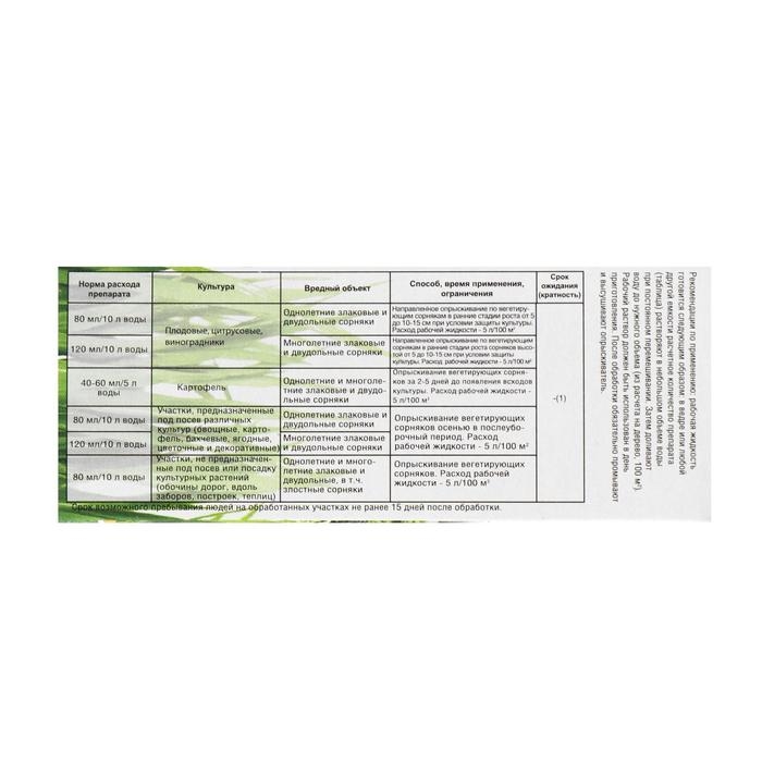 ПРИМЕНЕНИЕ/НОРМА РАСХОДА: - плодовые, цитрусовые культуры, виноградники: однолетние злаковые и двудольные сорняки: 80мл/10л воды; многолетние злаковые и двудольные сорняки:120мл/10л воды, направленное опрыскивание вегетирующих сорняков в ранние стадии роста от 5 до 10-15см при условии защиты культуры, расход - 5л/100м; - картофель: однолетние и многолетние злаковые и двудольные сорняки: 40-60мл/5л воды опрыскивание вегетирующих сорняков за 2-5 дней до появления культуры, расход - 5л/100м2; - участки под посев различных культур: однолетние злаковые и двудольные сорняки: 80мл/10л воды; многолетние злаковые и двудольные сорняки: 120мл/10л воды, опрыскивание вегетирующих сорняков осенью в послеуборочный период, расход - 5л/100м.
