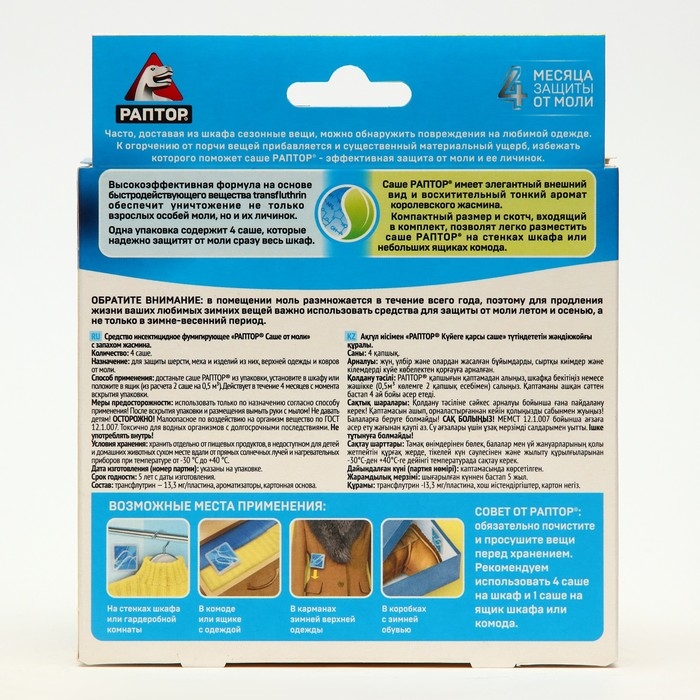 После активации секции действующее вещество начинает постепенно заполнять пространство, смешиваясь с молекулами воздуха. После того, как в шкафу или ящике комода будет набрана нужная его концентрация, наступает уничтожение моли и ее личинок, которые оказались внутри пространства. Для новых насекомых секция создает эффективный защитный барьер в период своего действия.Transfluthrin (трансфлутрин) – современное быстродействующее вещество, эффективно уничтожит не только бабочек моли, но и ее личинки. Благодаря высокой летучести и проникающей способности трансфлутрин поражает насекомых в 10 раз быстрее, чем любой другой из известных пиретроидов. Инсектицид контактной и ингаляционной активности с быстрым действием против насекомых.Применение: Аккуратно извлеките саше из упаковки. Разместите саше в шкафу или ящиках для одежды (2 саше на 0,5 м³). Важно! Средство будет защищать вашу одежду в течение 4-х месяцев с момента вскрытия упаковки. Для достижения наилучшего результата используйте 4 саше на шкаф и 1 саше для каждого ящика. А для дополнительной защиты вы можете воспользоваться аэрозолем от моли РАПТОР