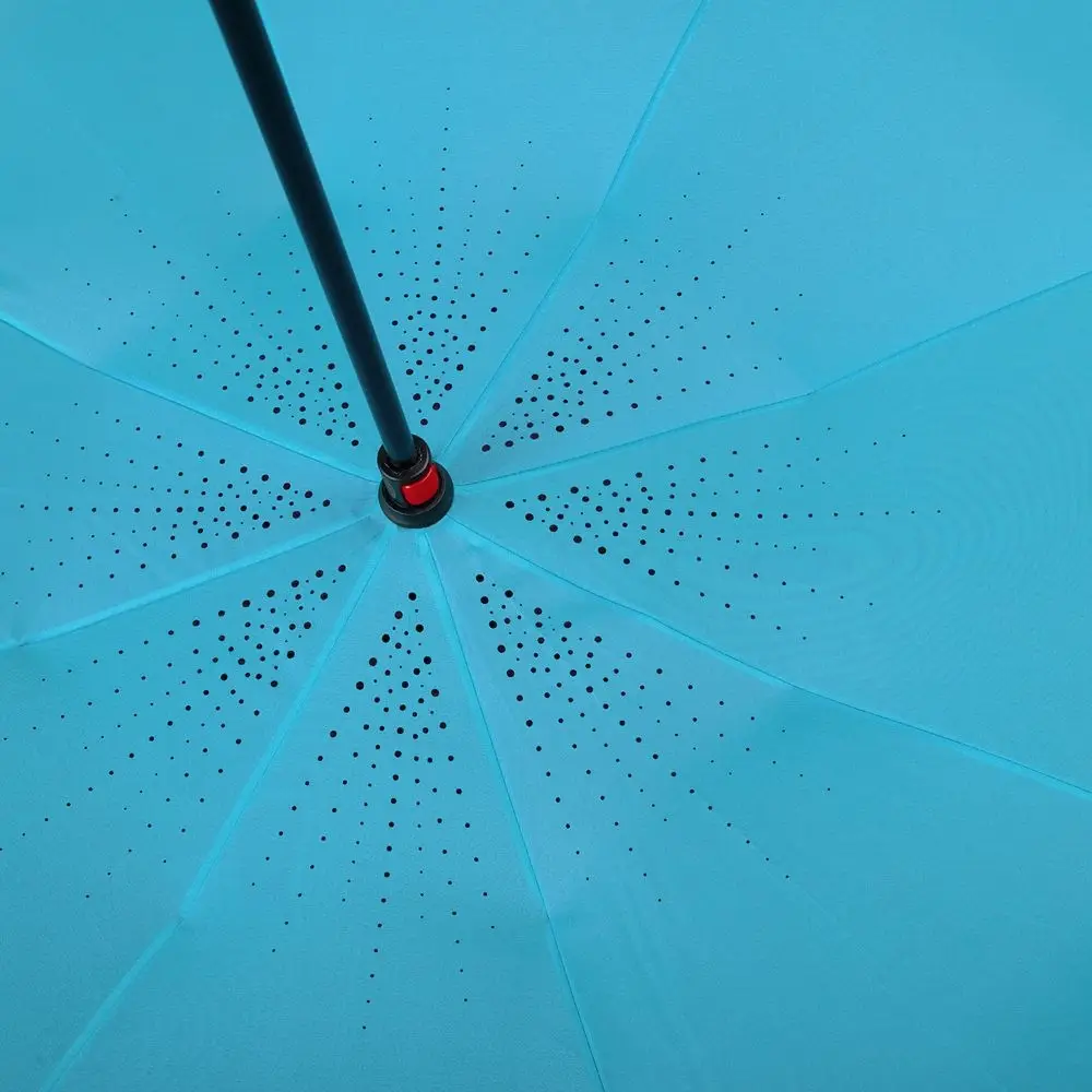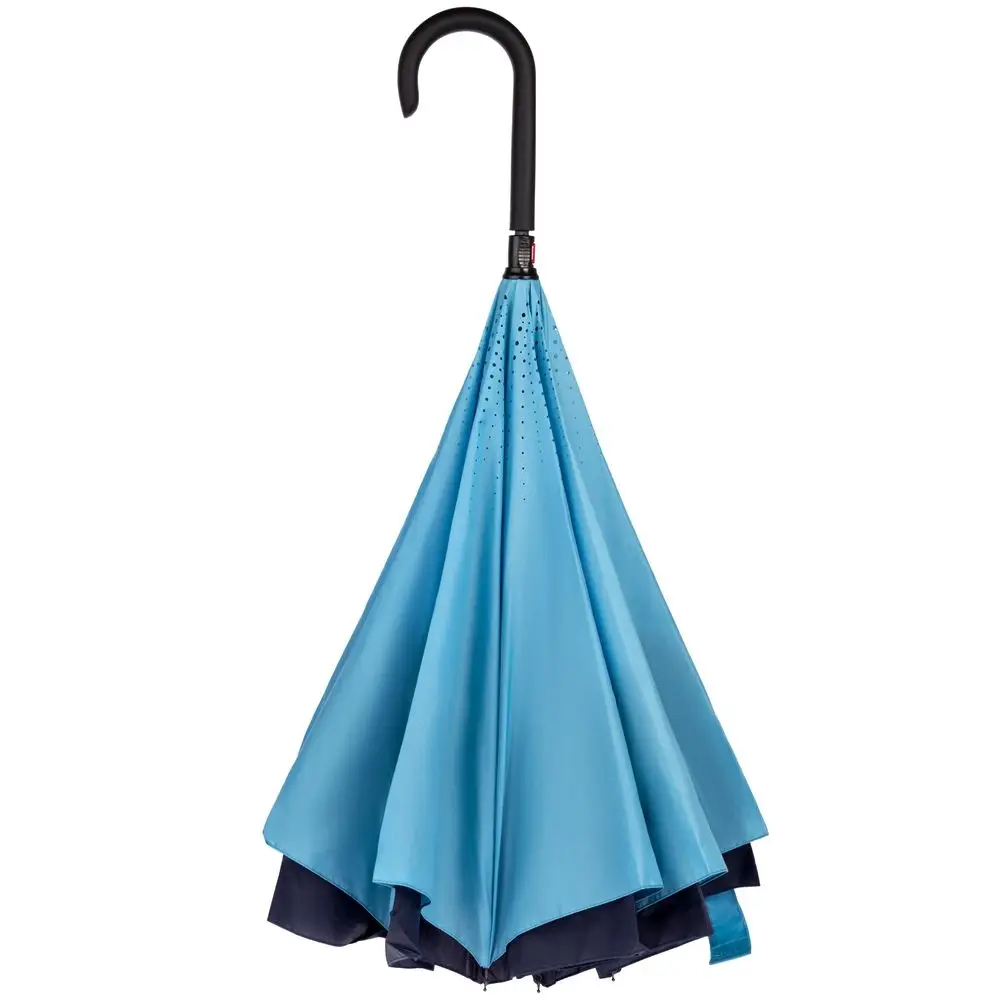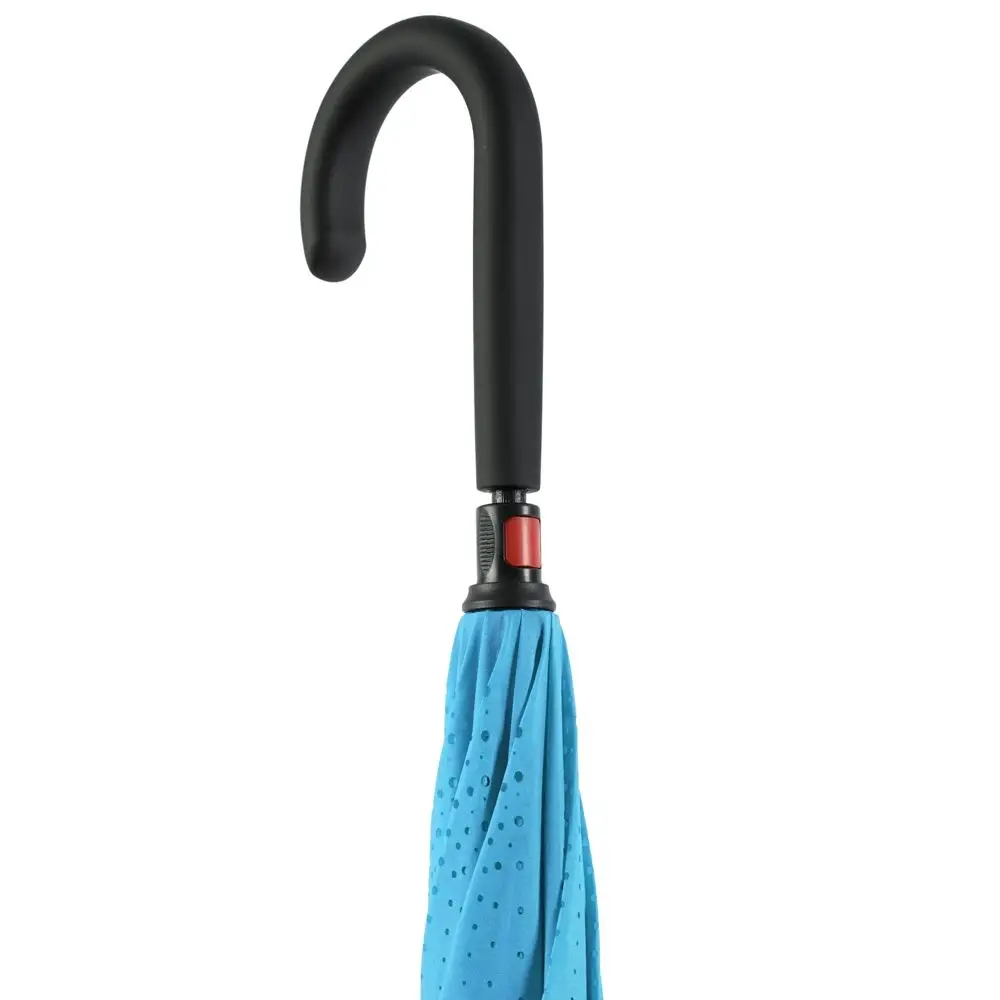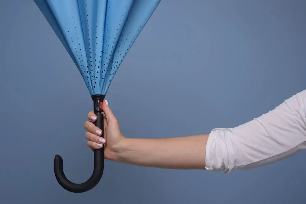 Это зонт-наоборот, зонт-наизнанку. Складываясь после дождя, он прячет мокрую поверхность в себя, а сухая остается снаружи. Для просушки его можно не только подвесить за ручку, как обычные зонты, но и поставить прямо на пол в полусложенном состоянии. Итог — мягкая щадящая просушка и минимум занятого мокрым зонтиком места.