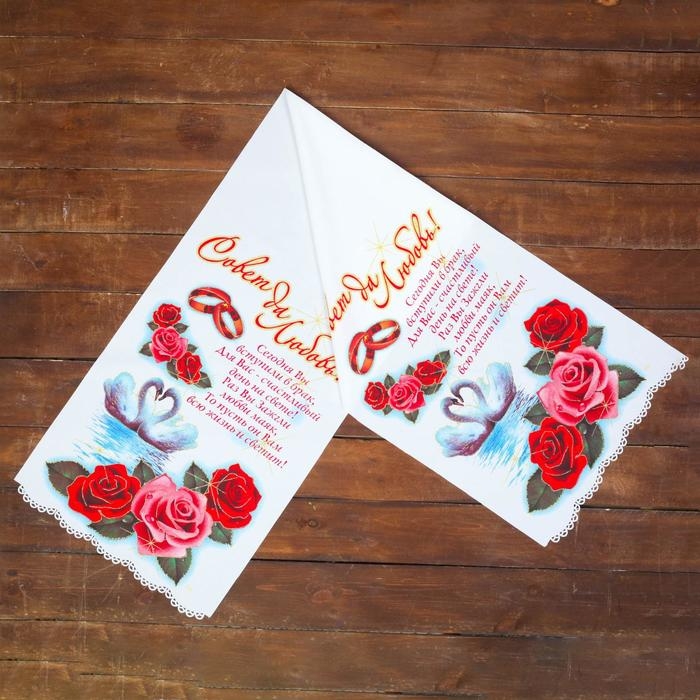 Рушник под ноги. Кто первым из молодых на него встанет — тому и быть хозяином в доме. Лучше отказаться от вариантов, на которых изображена пара голубей или лебедей, а также кольца. Считается, что супруги могут затоптать своё счастье. Лучше отдать предпочтение геометрическим или растительным узорам.