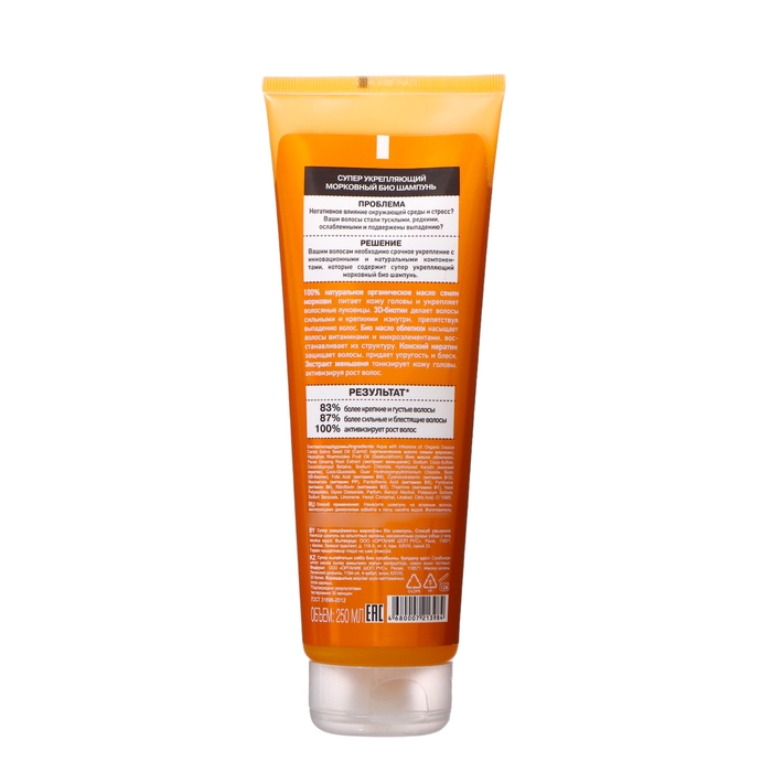 Способствует активации роста волос, питанию, укреплению, приданию блеска, против их выпадения. Подходит для ломких, тонких и поврежденных волос. Содержит кератин, витамины группы B, облепиховое масло, экстракт моркови. Без парабенов и сульфатов.