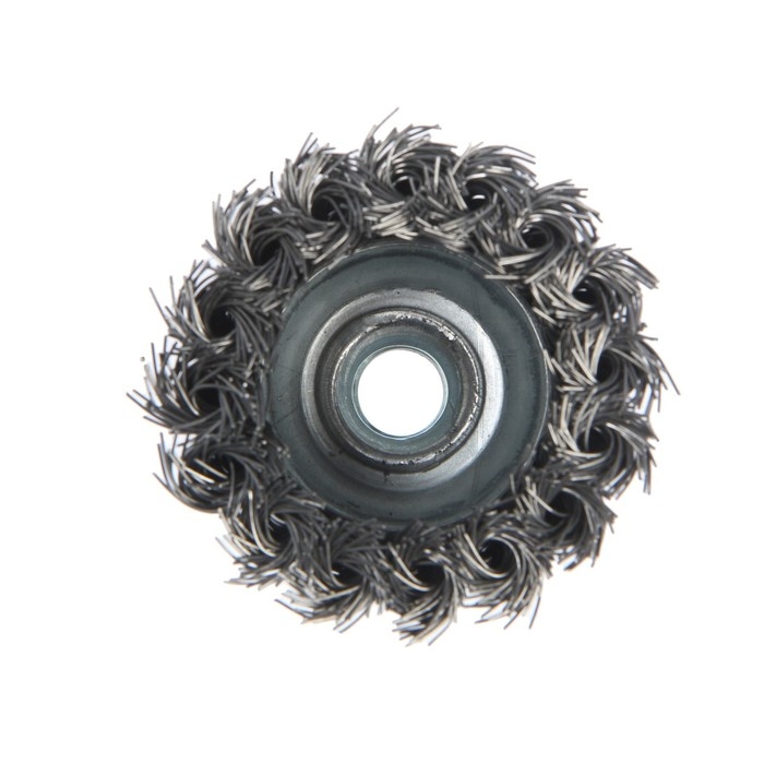 Металлическая кручёная щётка чашечного типа ТУНДРА предназначена для грубой зачистки металлических поверхностей от ржавчины и грязи, удаления неровностей и сглаживания сварных швов. Применяется совместно с угловой шлифовальной машиной, тип крепления - М14.