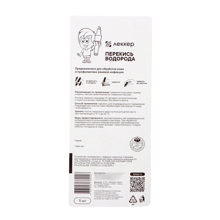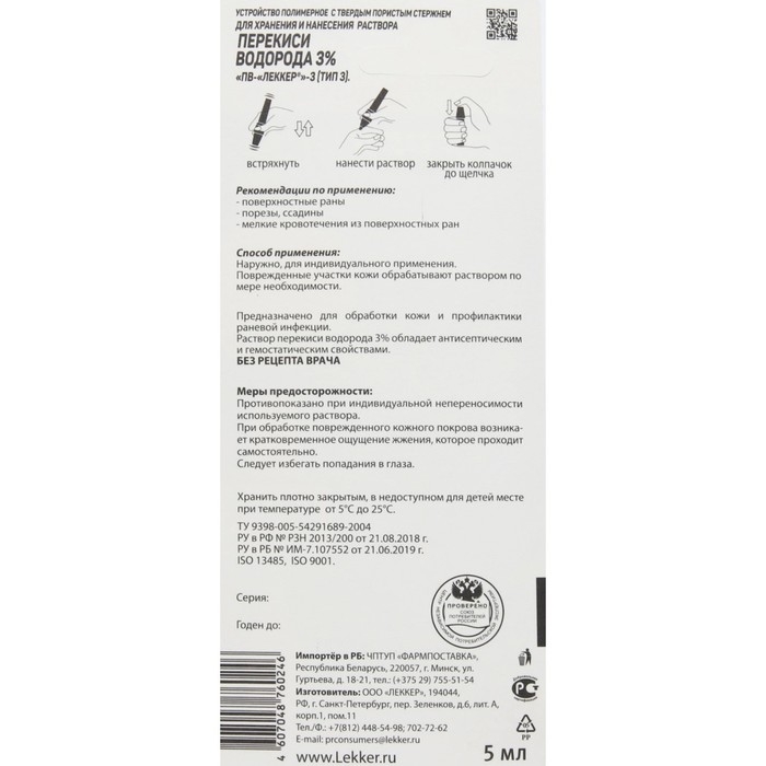 Перекись водорода Lekker тип-3, 5 мл. - средство для обработки кожи с целью профилактики раневой инфекции. Обладает антисептическими и гемостатическими свойствами.