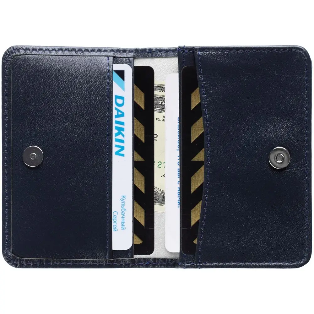 Футляр изготовлен из телячьей кожи, контрастная подкладка из искусственной свиной кожи. Вместительность до 40 визиток.