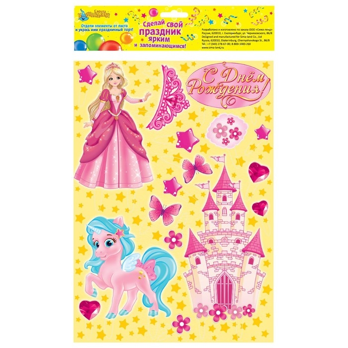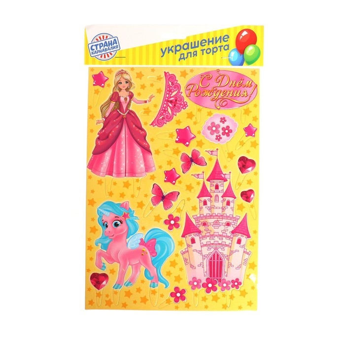 Набор топперов для украшения торта «С днём рождения!», принцесса — прекрасный выбор для вашего кэнди-бара. Украсить праздничный стол с его помощью сможет даже ребёнок. Всё, что нужно сделать — это отсоединить понравившиеся картинки из плотного картона от подложки и воткнуть их в торт, пирог или пирожное. Готово!