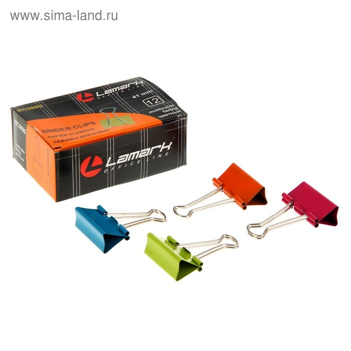 Зажимы для бумаг цветные НЕОН. Размер 41 мм. 12 штук в цветной картонной коробке.